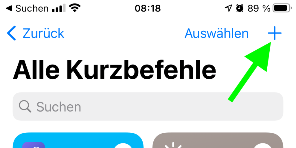 Öffnen Sie die „Kurzbefehle“-App auf Ihrem iPhone oder iPad und gehen Sie auf die Registerkarte „Meine Kurzbefehle“. Tippen Sie auf das Pluszeichen (+) oben rechts, um eine neue Verknüpfung zu erstellen.