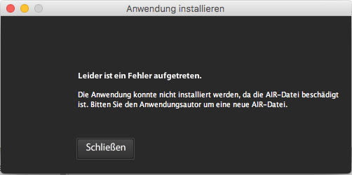 „Die Anwendung konnte nicht installiert werden, da die AIR-Datei beschädigt ist. Bitten Sie den Anwendungsautor um eine neue AIR-Datei.“