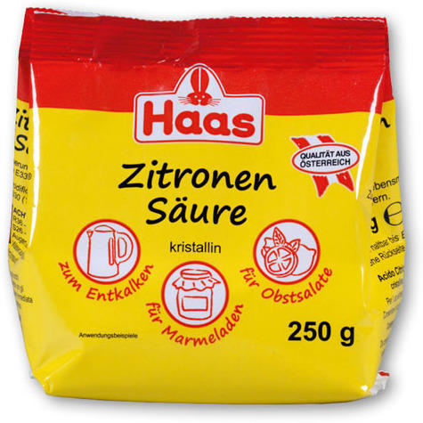 Es geht auch günstiger und natürlicher. Mit Zitronensäurenpulver der Firma Haas.